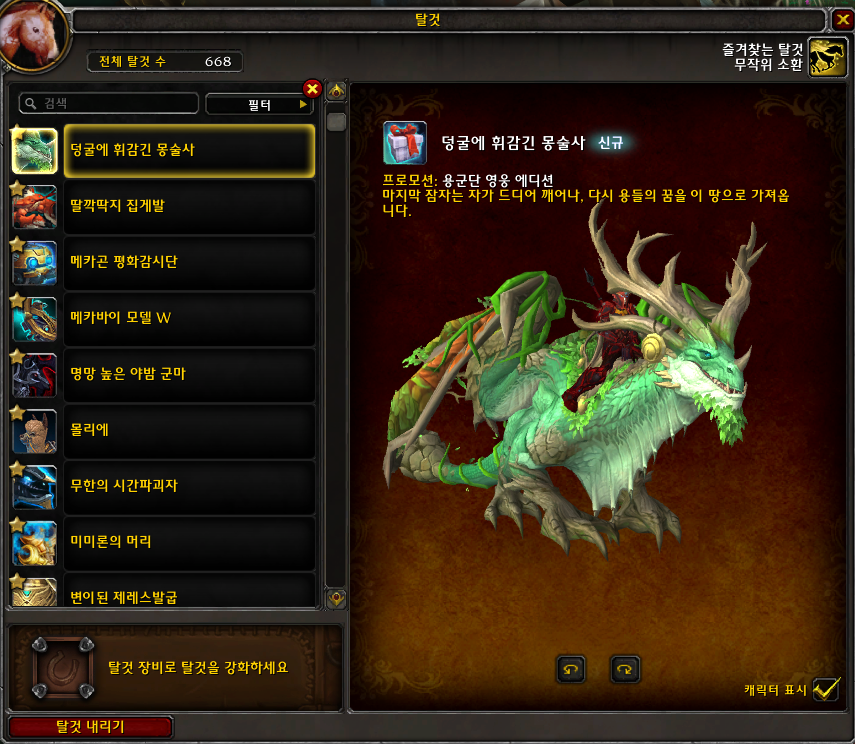 덩굴에 휘감긴 몽술사 탈것은 용군단 사전예약 패키지 구매보상입니다.