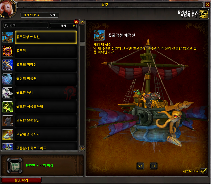공포각성 해적선 탈것은 블리자드샵에서 구매하는 탈것입니다.