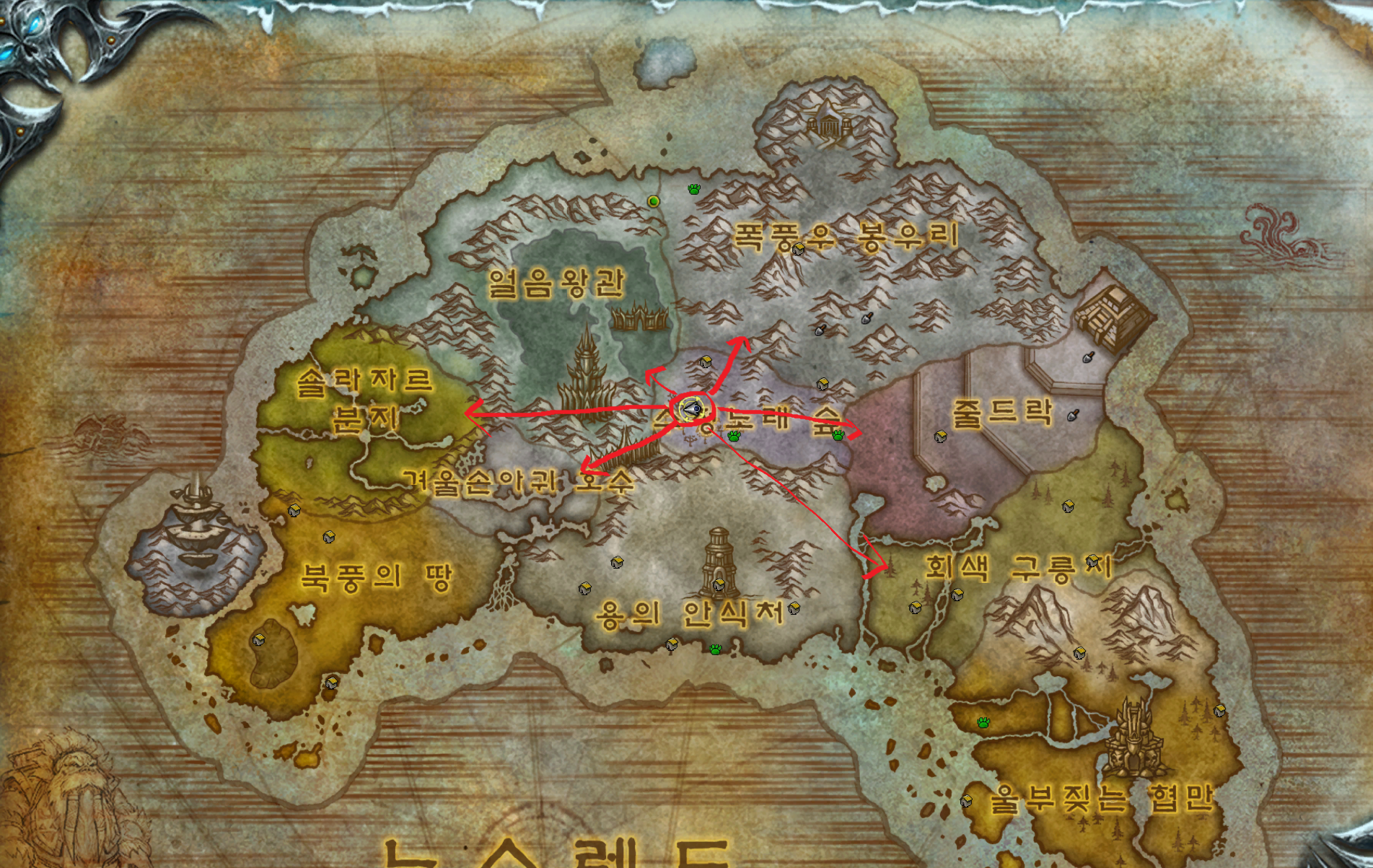폭풍우 봉우리 / 줄드락 / 겨울손아귀 호수 / 숄라자르 분지 / 회색 구릉지 가는법