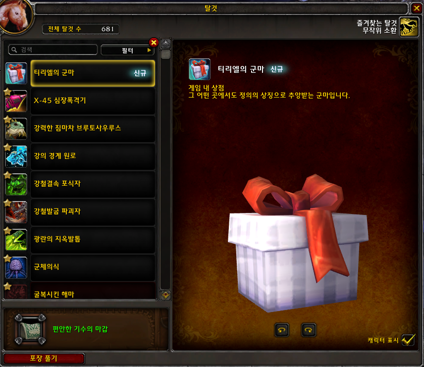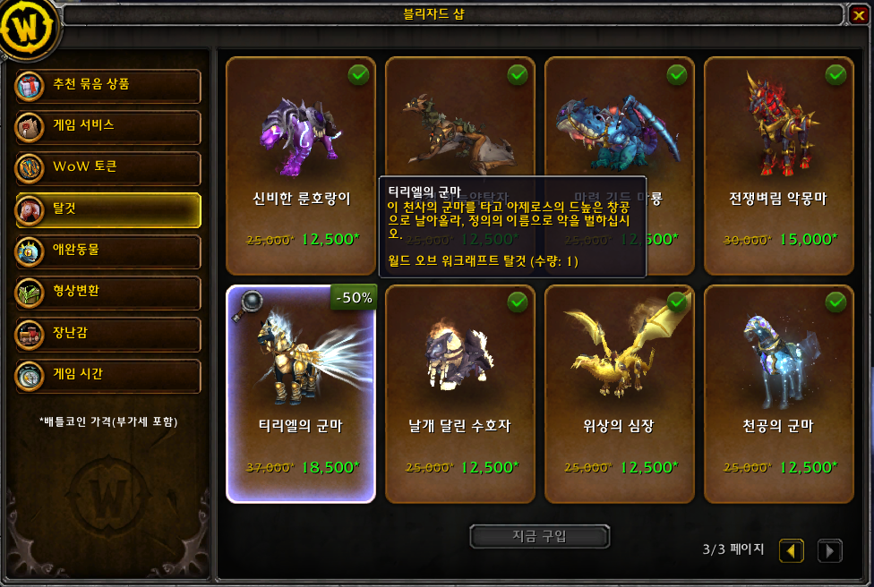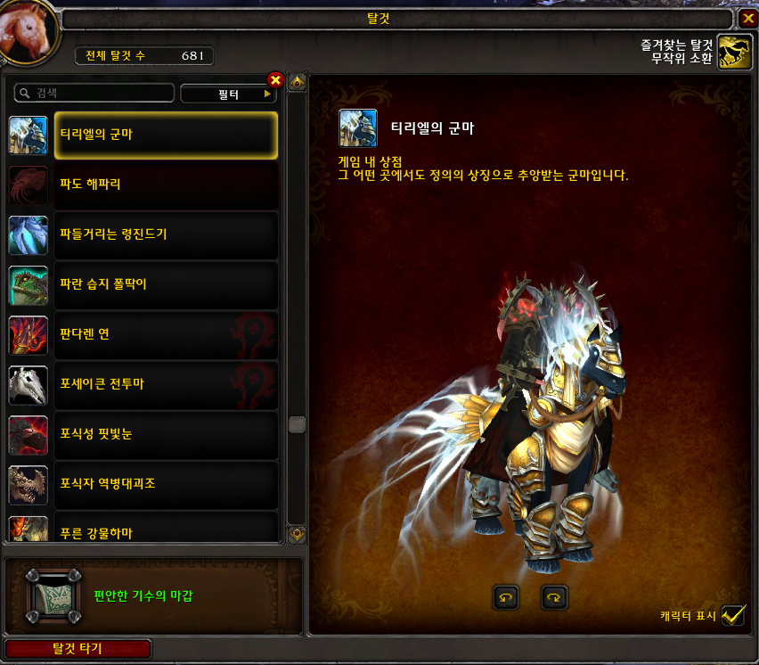 티리엘의 군마 탈것은 블리자드샵에서 구매하는 탈것입니다.