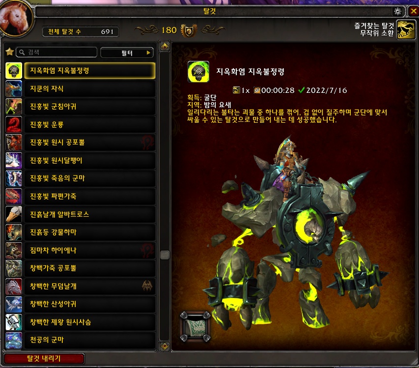 2022.07.16 지옥화염 지옥불정령 획득 691번째 탈것