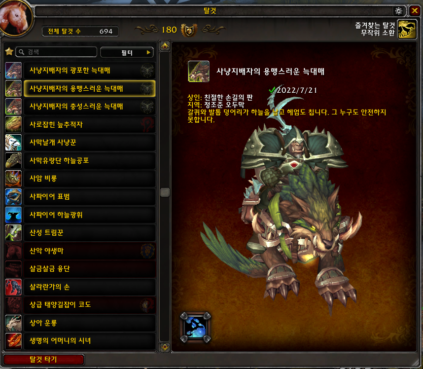 2022.07.21 사냥지배자의 충성스러운 늑대매 획득 692번째 탈것