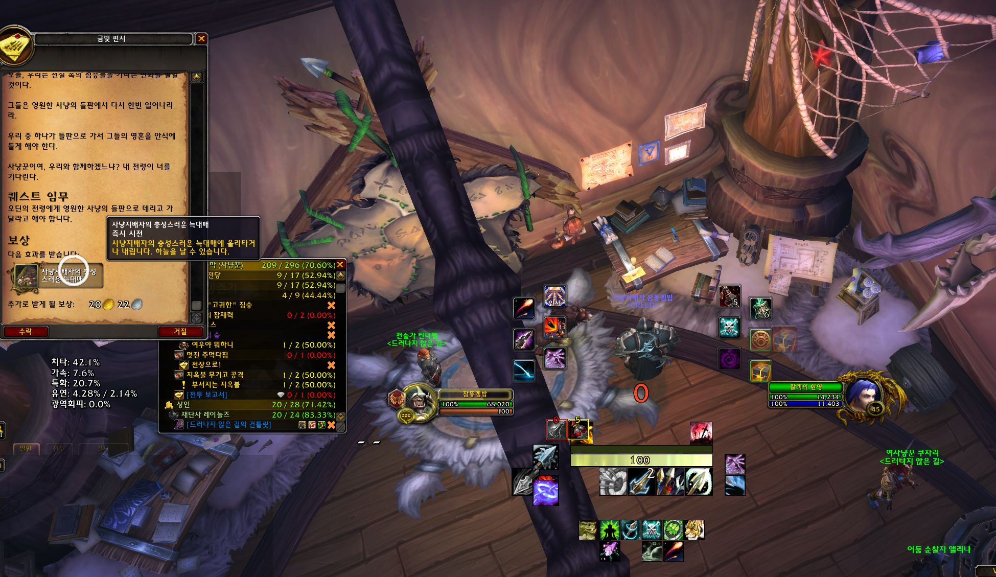 군단척결의 용사들퀘를 완료하고 정조준 오두막에 가니 탁자위에 탈것주는 퀘가 생겼습니다.