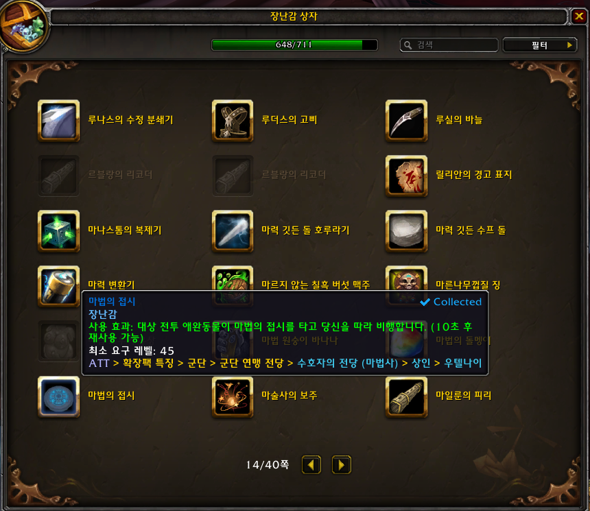 마법의 접시 장난감은 군단 확장팩 장난감으로 마법사 전용입니다. 마법사만 구매가능합니다.