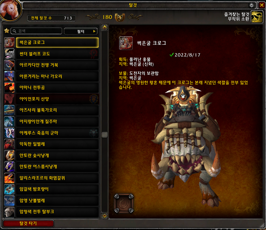 2022.08.17 썩은굴 크로그 획득 713번째 탈것