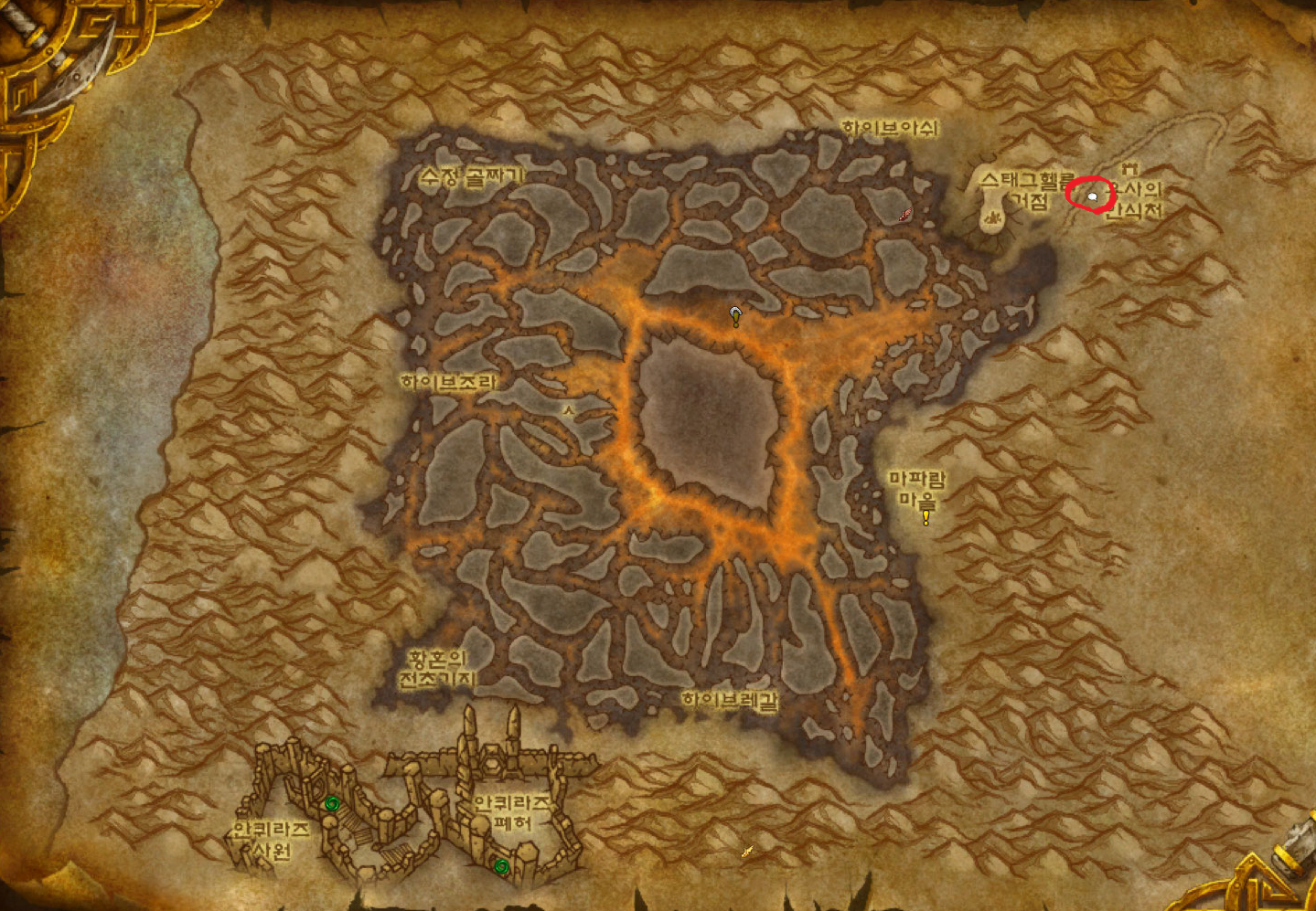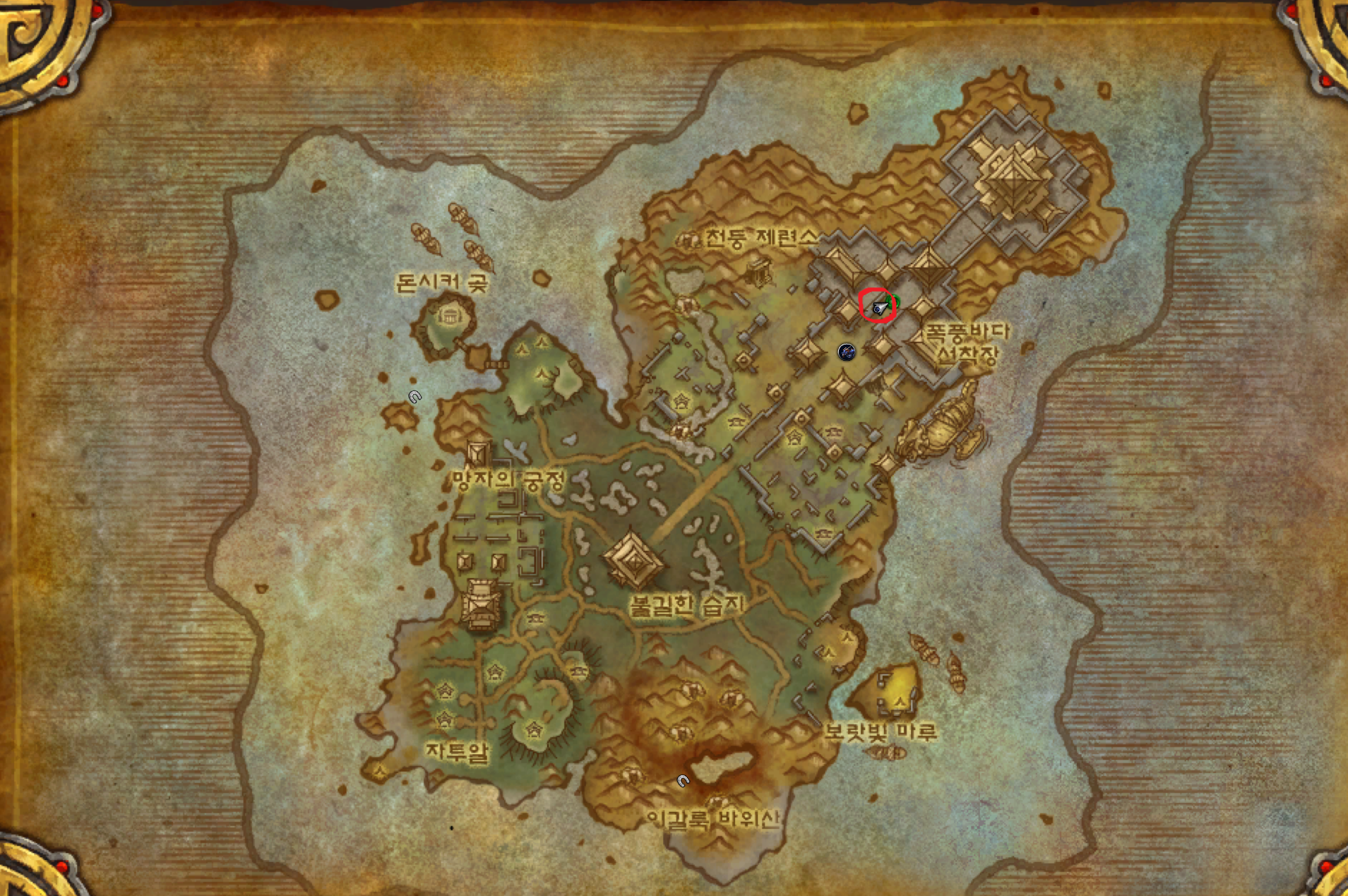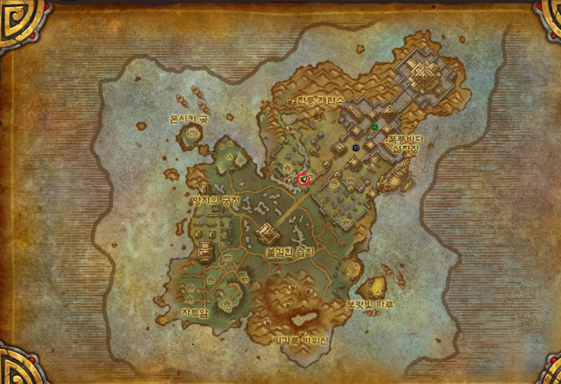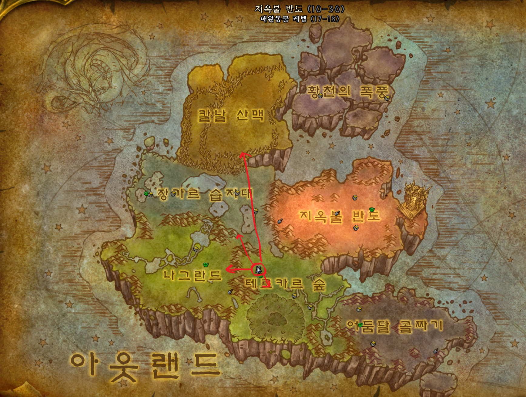 저습지 / 모단 호수 / 이글거리는 협곡 / 황야의 땅 / 불타는 평원 가는법