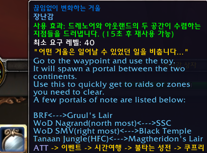 정말 갓이라는 말을 붙여도 아쉽지 않은 대박 장난감입니다. 아웃랜드에서 해당장난감을 사용하면 드레노어로 순간이동되고 드레노어에서 사용하면 아웃랜드로 순간이동 가능합니다.