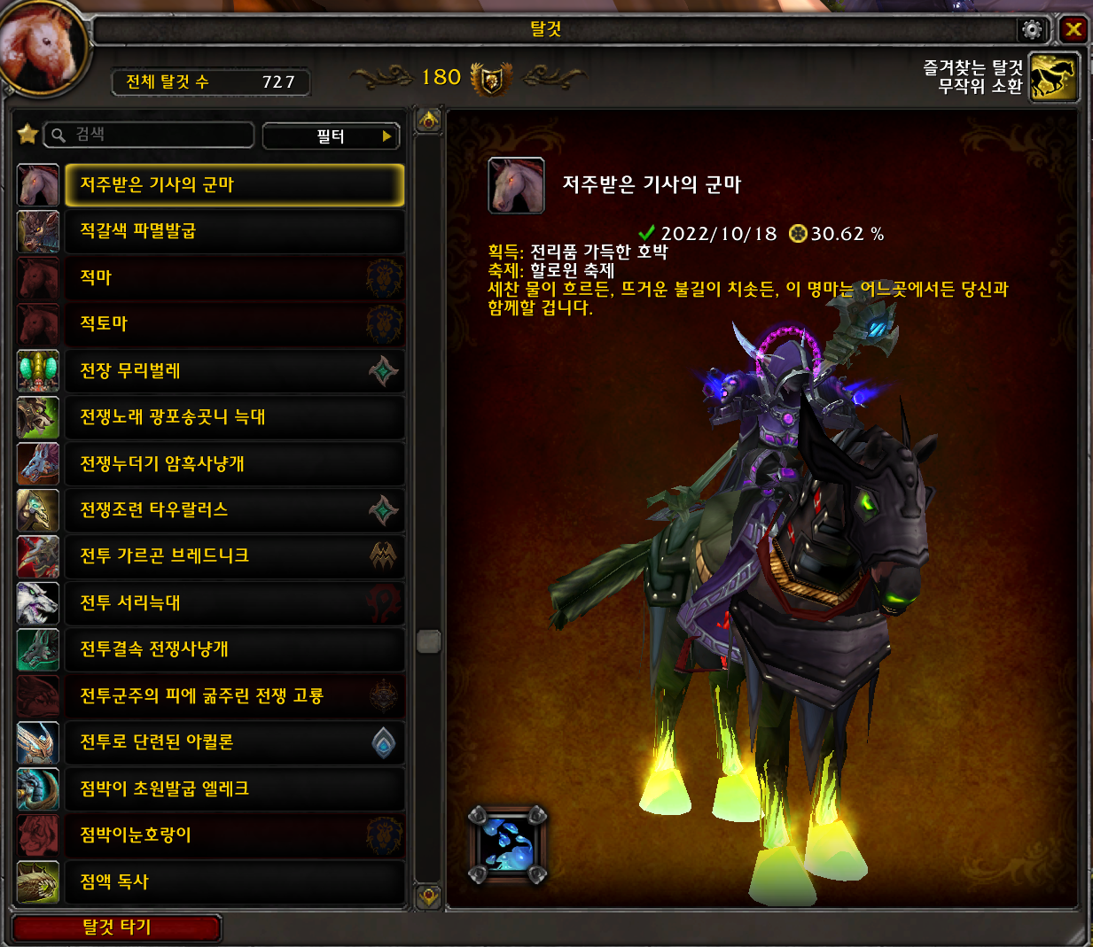 저주받은 기사의군마는 할로윈주간에만 획득가능한 탈것입니다.