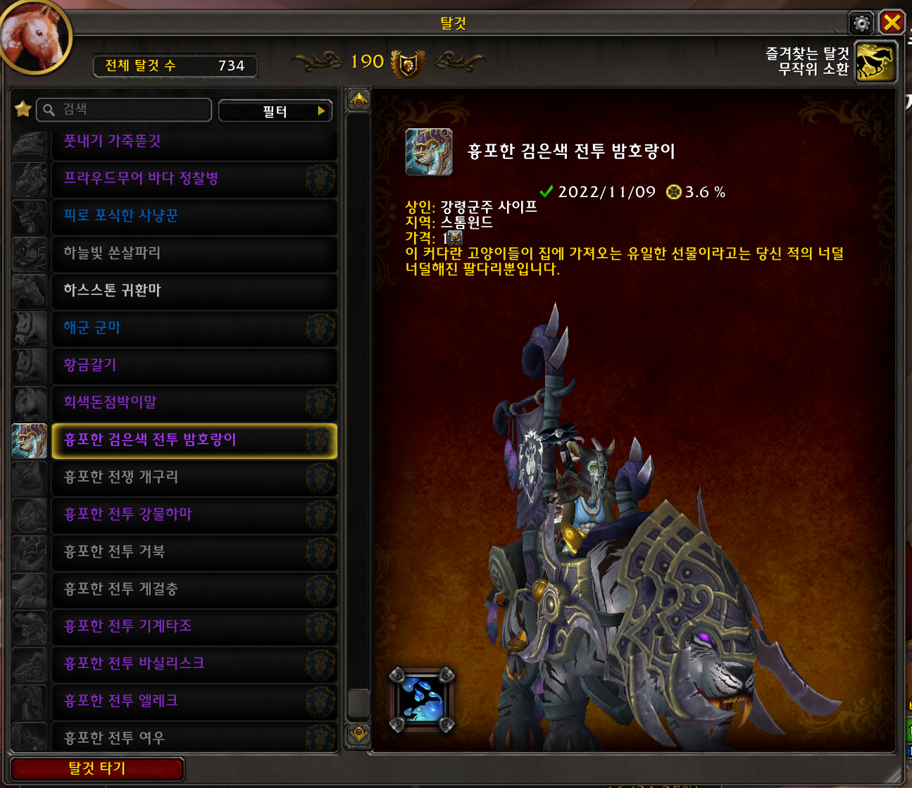 2022.11.09 흉포한 검은색 해골군마 / 흉포한 검은색 전투 밤호랑이 획득 739번째 탈것