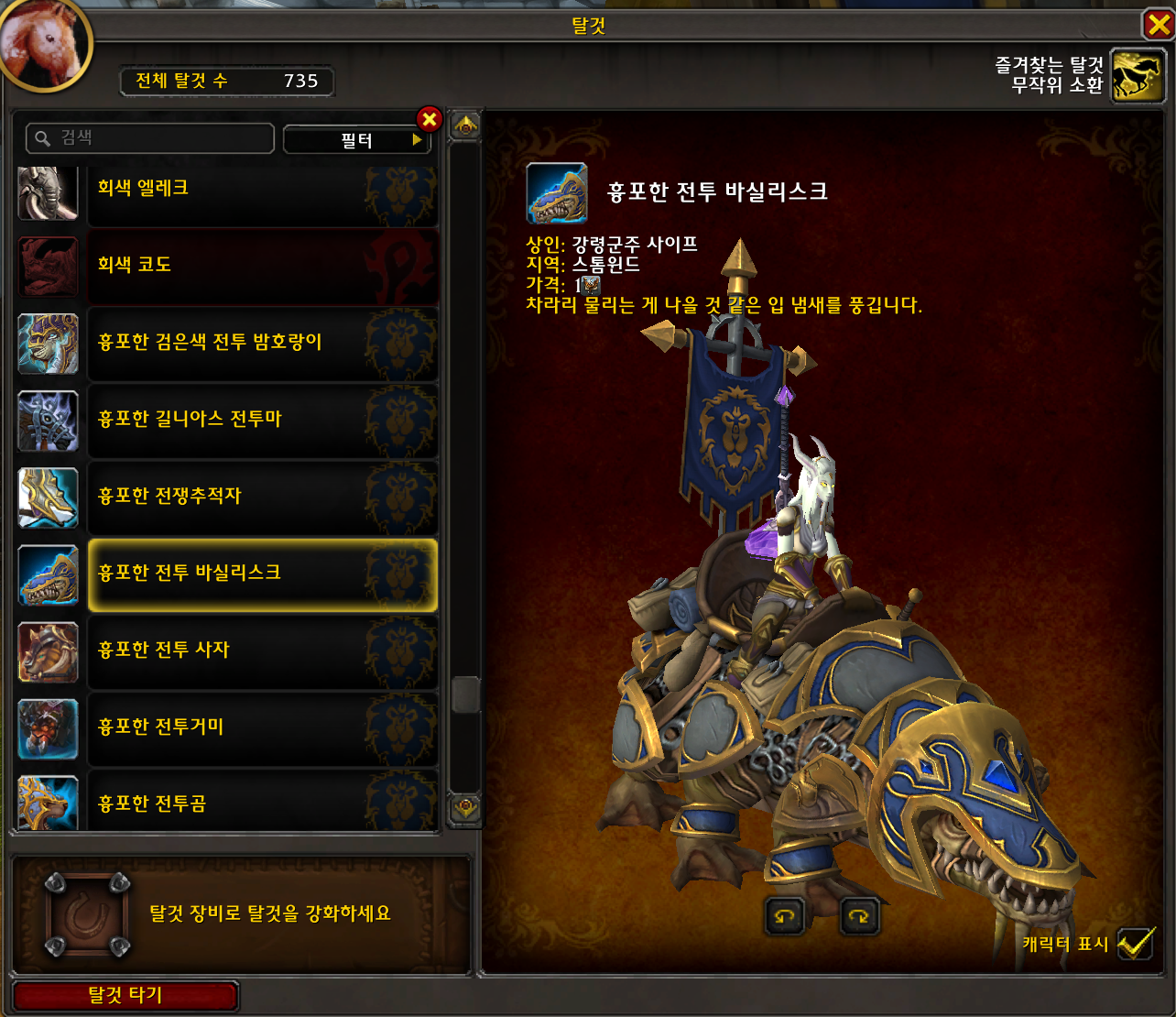 흉포한 전투 바실리스크는 흉포한 안장으로 구매하는 탈것입니다.