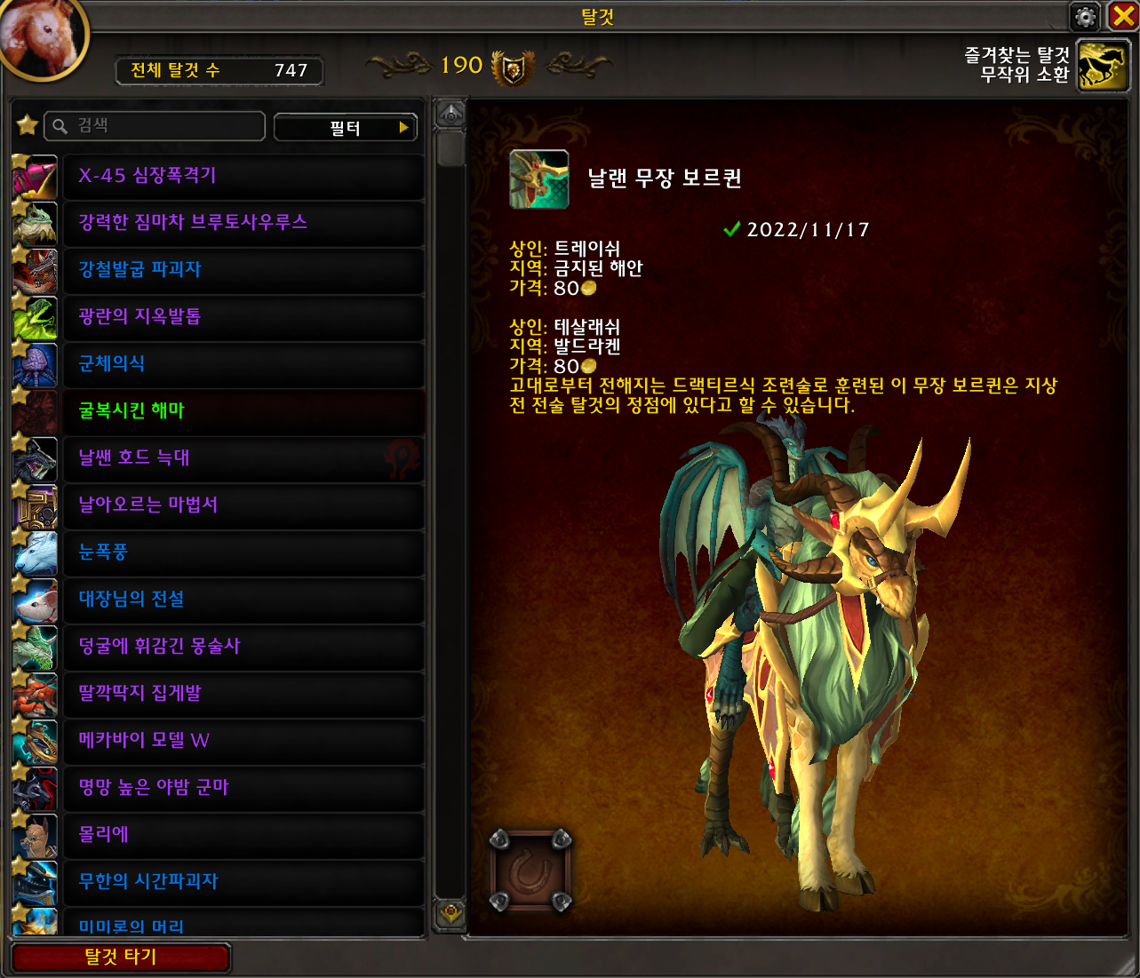 | [와우탈것]흉포한 전투 바실리스크 (6) | 2022.11.15 |