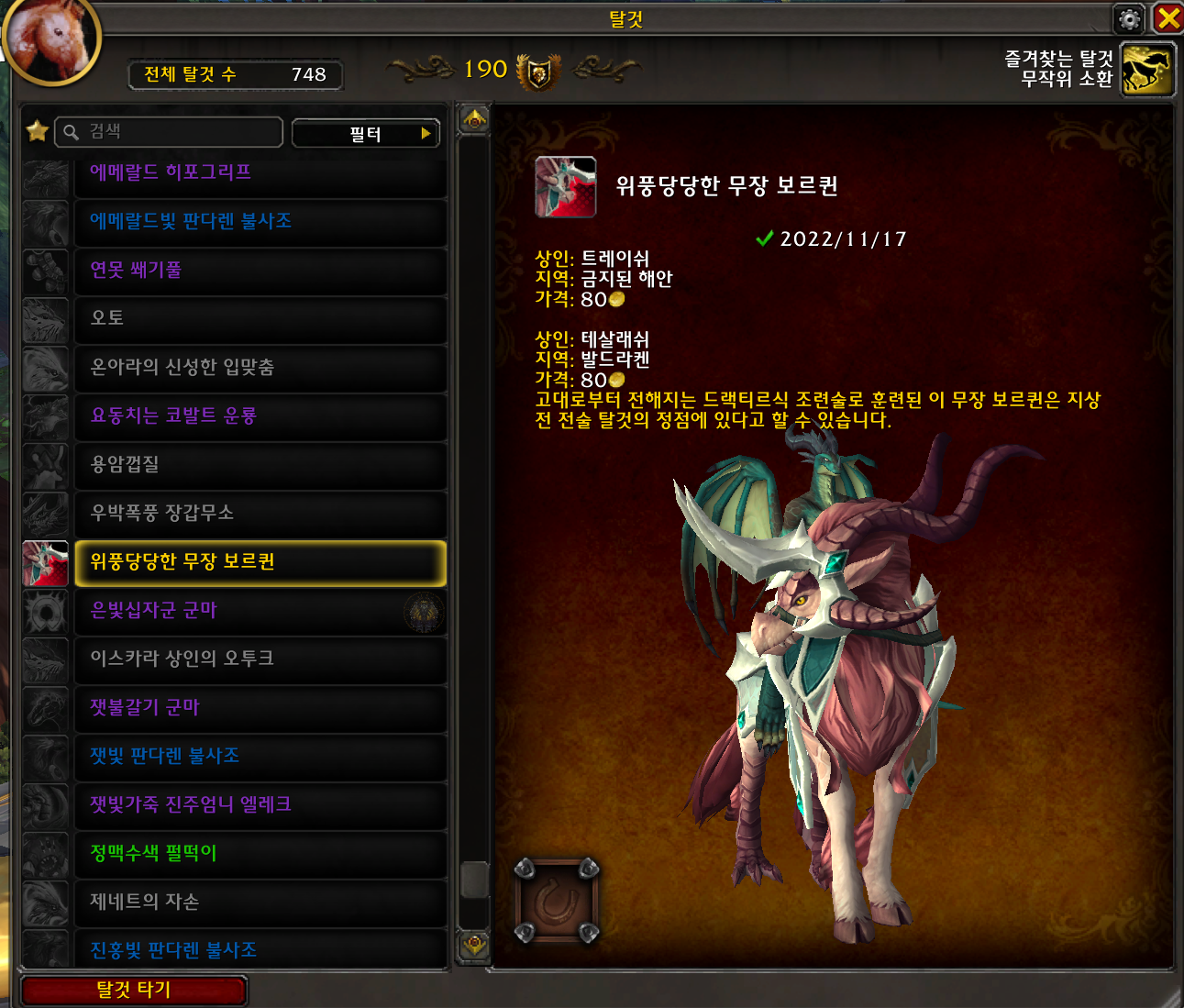 2022.11.17 흑요석 보르퀸/사파이어 보르퀸/진홍빛 보르퀸/청동 보르퀸/날쌘 무장 보르퀸/무장 보르퀸 지맥걸이/수호자 보르퀸/위풍당당한 무장 보르퀸 획득 742~749번째 탈것