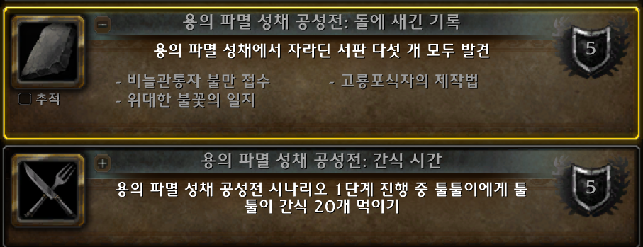 파멸 성채 공성전에서 해야되는 업적이 돌에 새긴 기록과 간식 시간 2개가 더있습니다.