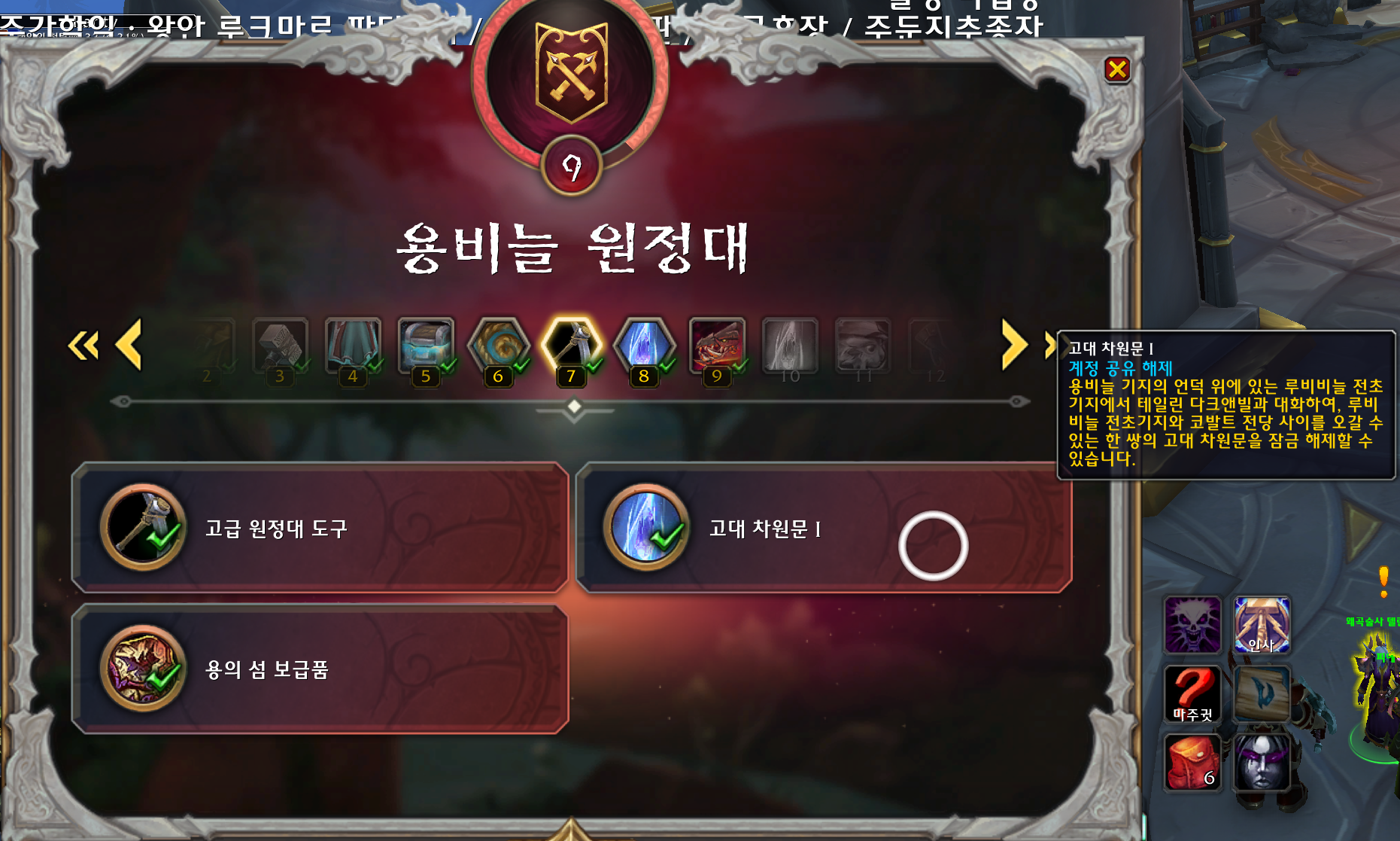 먼저 첫 고대차원문을 이용하려면 용비늘 원정대 영예가 7이되어야 합니다.