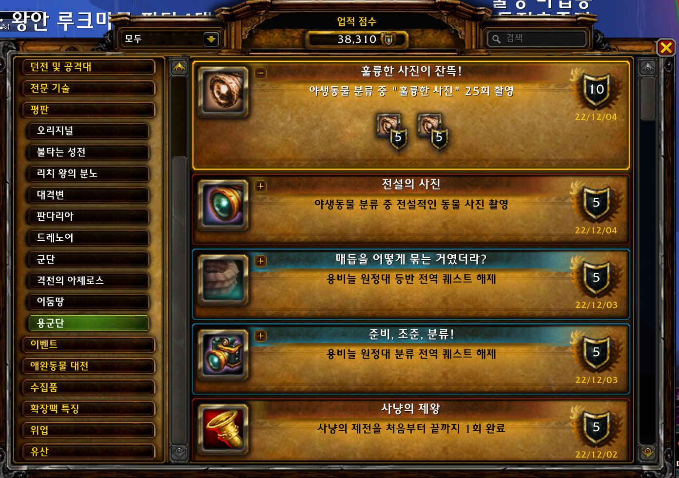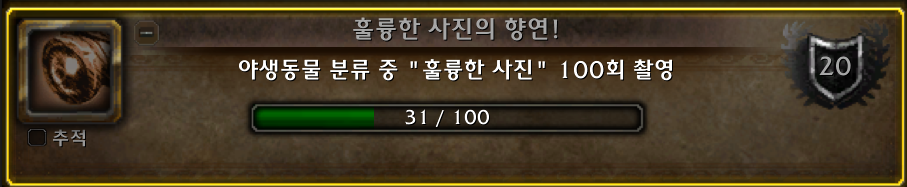 2022.12.03 훌륭한 사진! 획득 5점짜리 38225점 훌륭한 사진! 업적은 용군단 업적으로 용비늘 원정대 영예가 8이되면 잠금해제 됩니다. 원정대 보급품에서 분류 장비 사진기를 찍을수 있게됩니다. 그