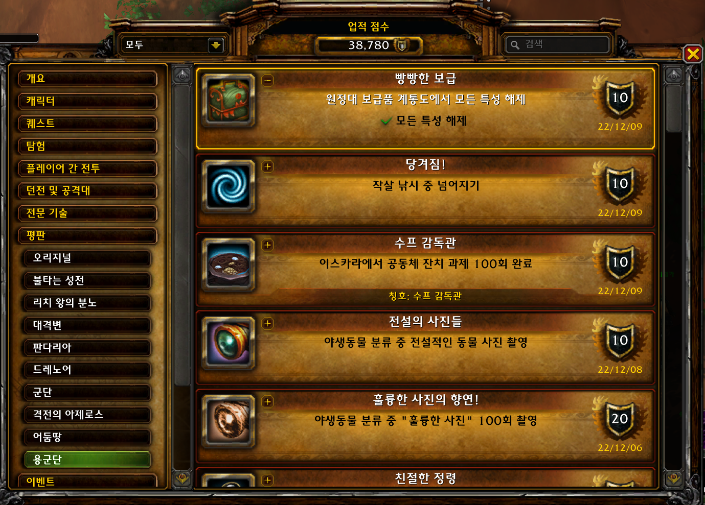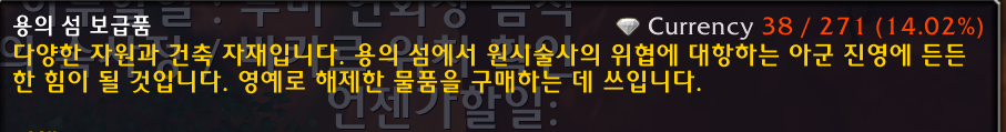 제 애드온상으로 용의 섬 보급품으로 하는 수집관련이 38/271이네요 용군단 이제 1주일했는데 벌써 14%나 완료된거보니