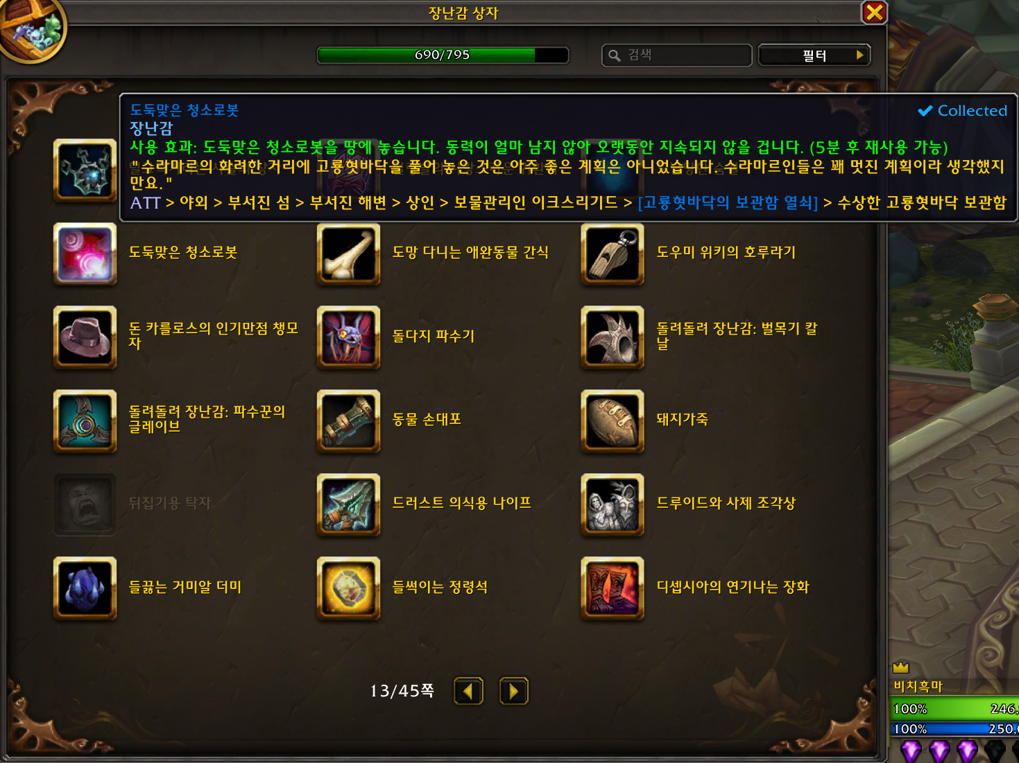 도둑맞은 청소로봇 장난감은 군단확장팩 장난감으로 고룡혓바닥의 보관함 열쇠로 상자를 열면 낮은확률로 획득하는 장난감입니다.