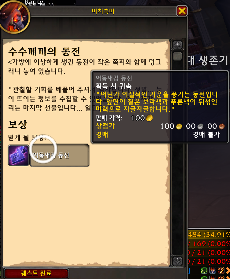 수수께끼의 동전 업적은 용군단 업적으로 모험안내서에서 주는 동전을 5번먹으면 됩니다.