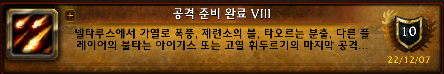 공격 준비 완료 VIII 업적도 쉽습니다. 제련장인 고렉전투에서 아무스킬도 안맞으면 됩니다. 개인업적입니다. 보통 다 되어있을 확률이 높습니다.