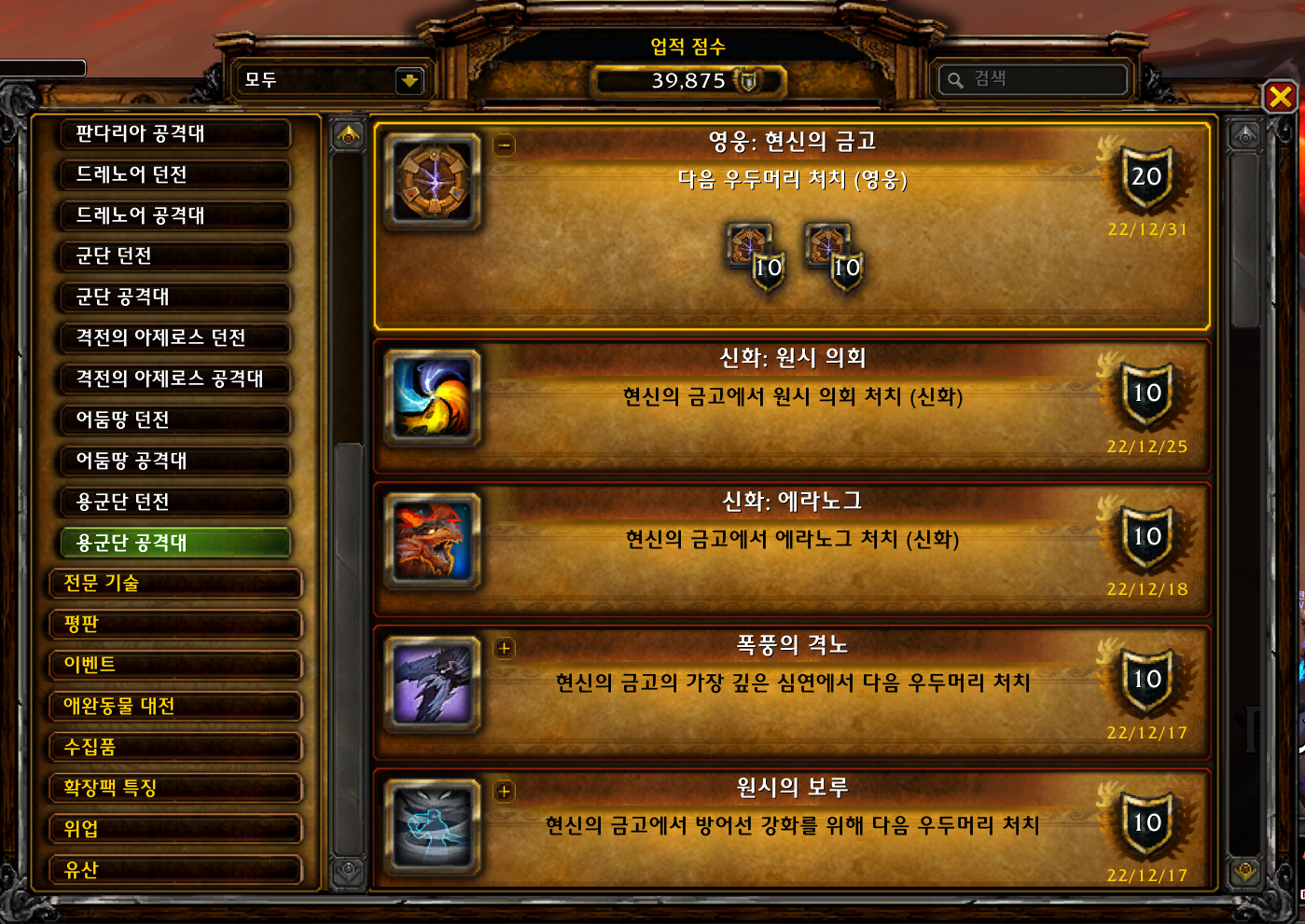 | [와우업적]영예의 용군단 영웅 - 후기 및 공략 (2) | 2022.12.26 |
