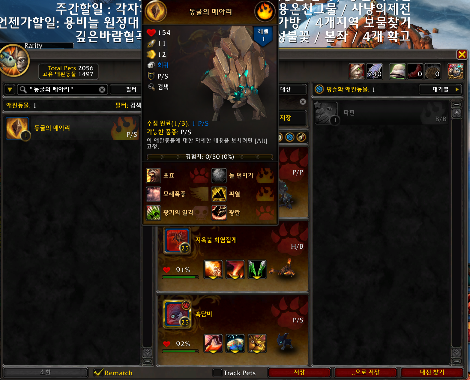 동굴의 메아리 애완동물은 용군단 애완동물로 폭풍이벤트 대지일때 획득가능합니다.