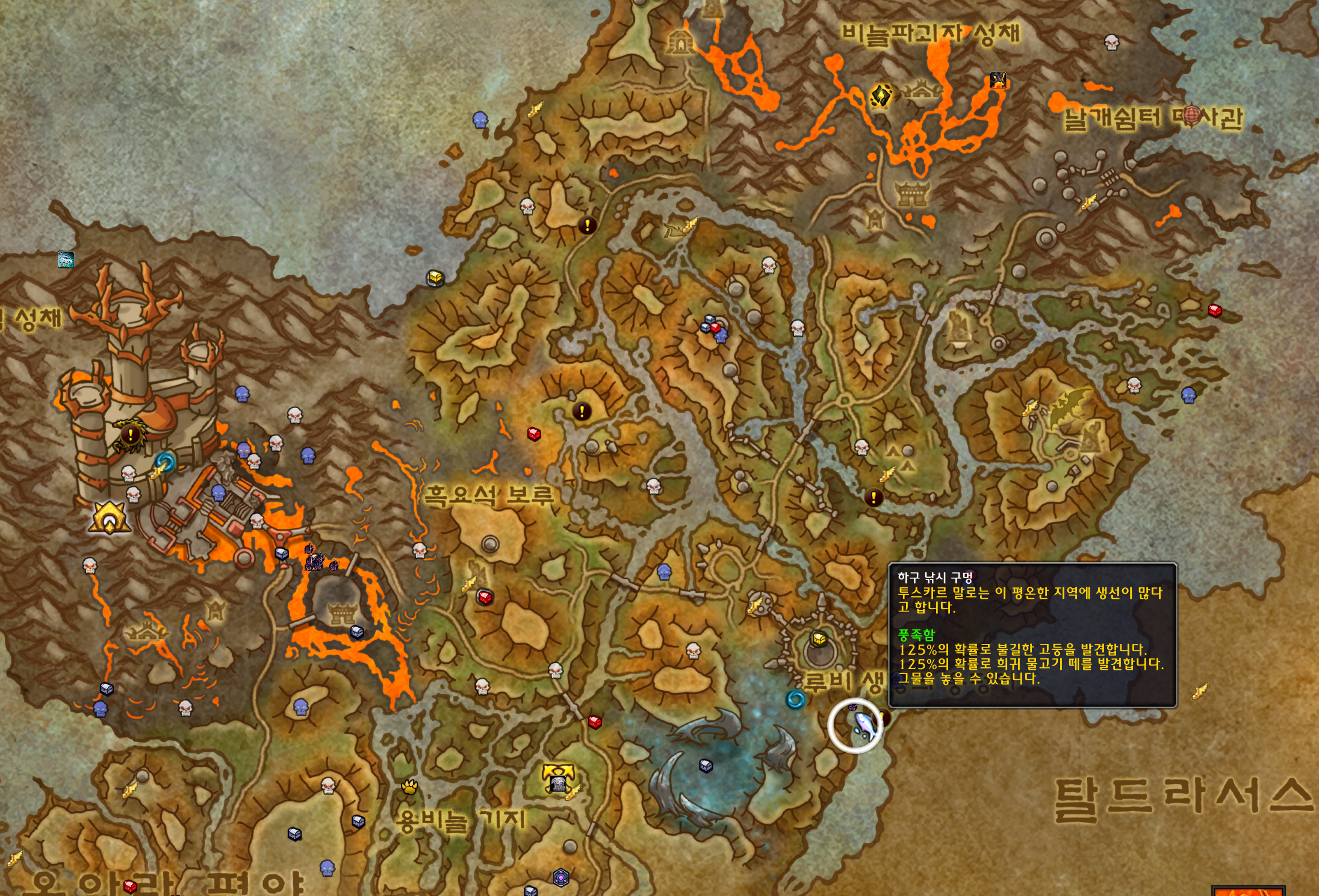 불타는 승천길 낚시 구멍 - 음울엄니의 낚시 구멍 - 티르홀드 낚시 구멍 - 울부짖는 용온천 낚시 구멍 순으로 나왔습니다.