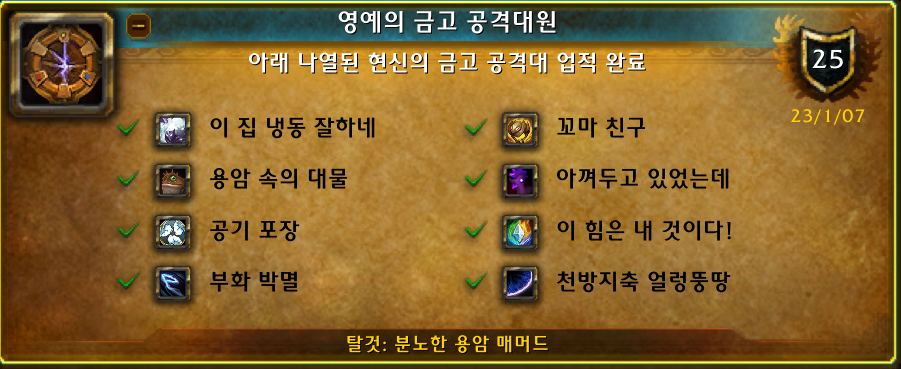 2023.01.07 영예의 금고 공격대원 획득 25점짜리 40075점 영예의 금고 공격대원은 현신의 금고 8마리를 특정조건을 달성하면서 네임드를 잡는 업적입니다. 이 집 냉동 잘하네 차원문의 돌을 집은다음