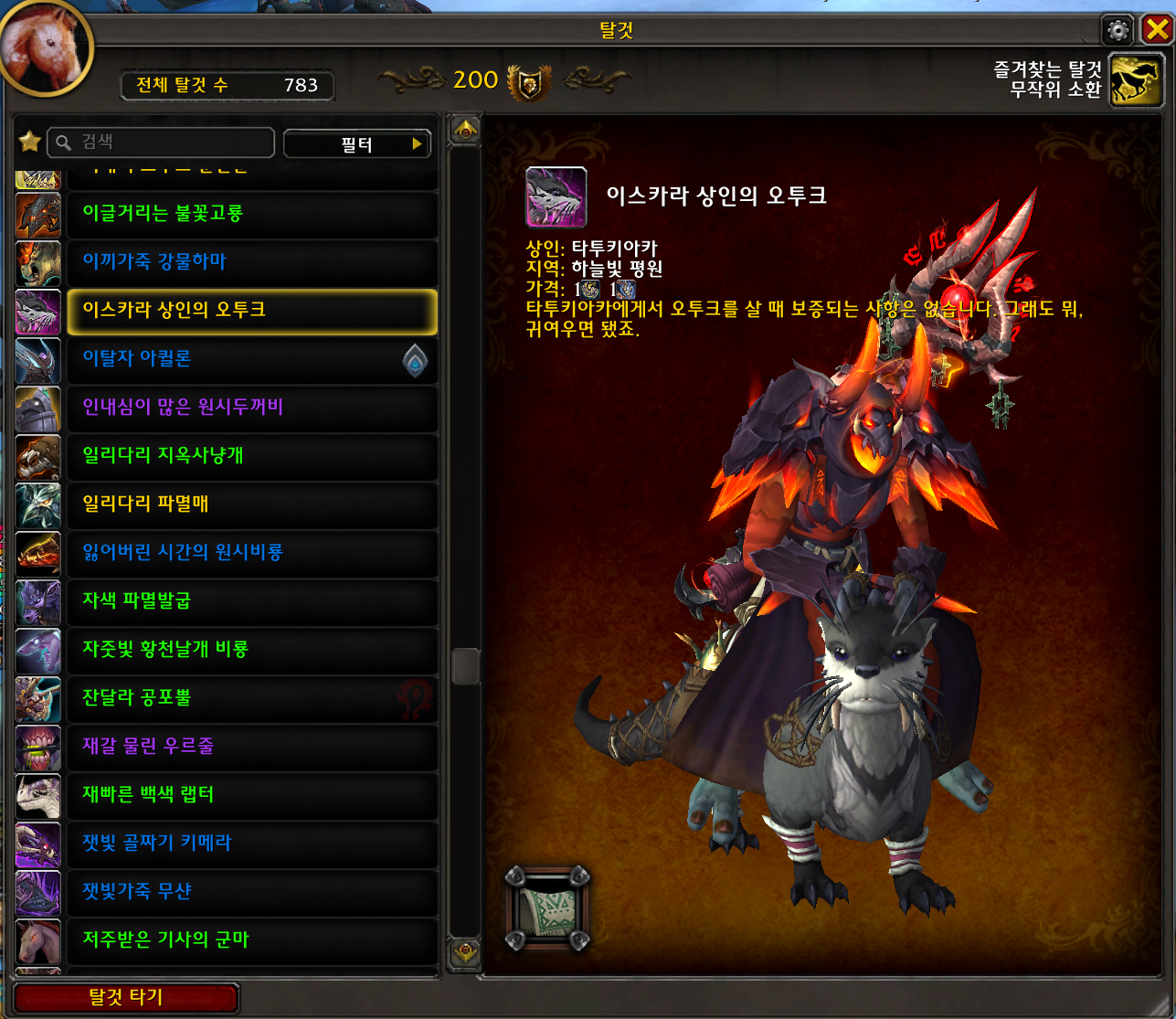 이스카라 상인의 오투크 탈것은 용군단 탈것으로 레이드 목걸이 2개로 교환하는 탈것입니다.