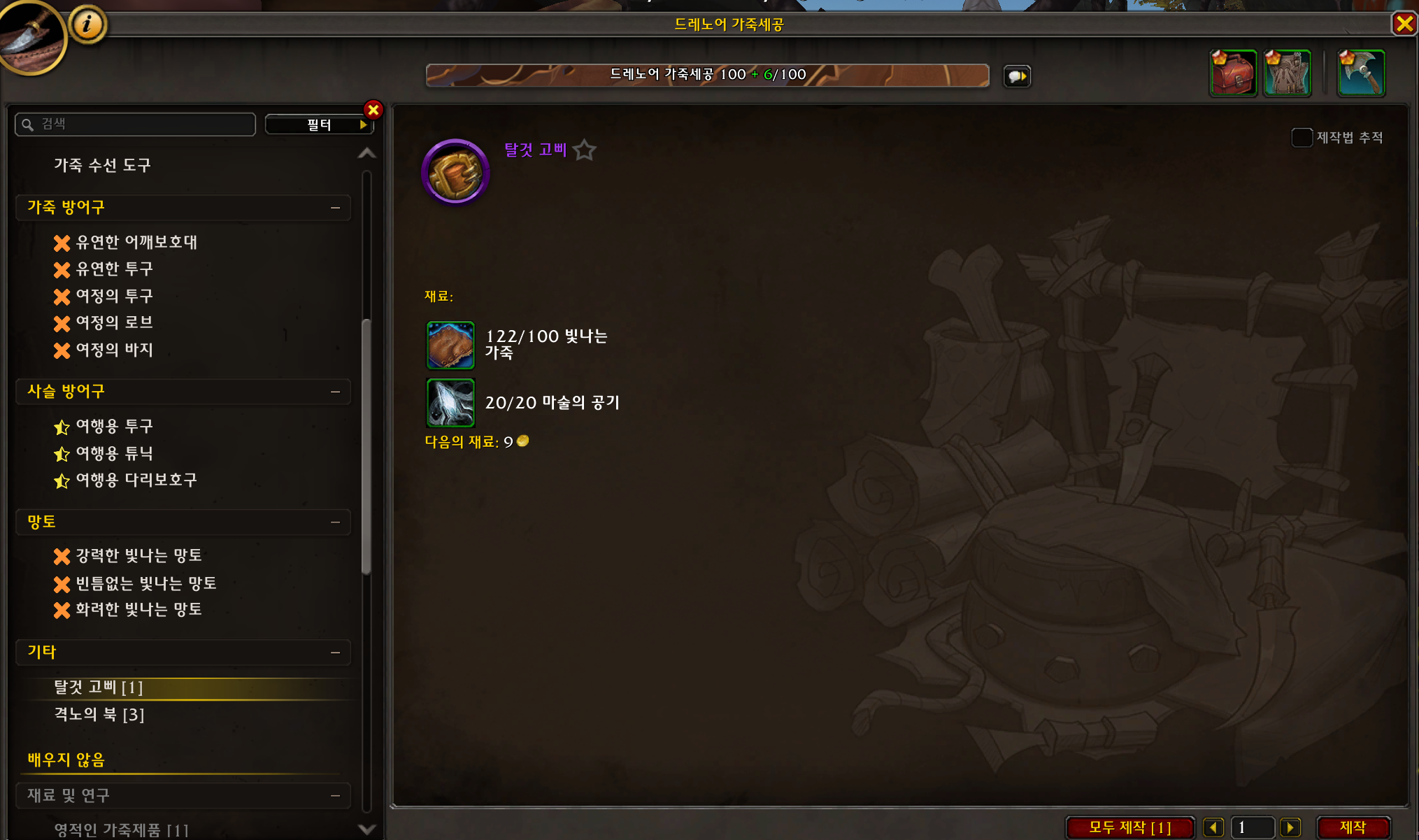드레노어 가죽세공의 비밀은 하루에 1개만 만들수있고 거래가 안됩니다.
