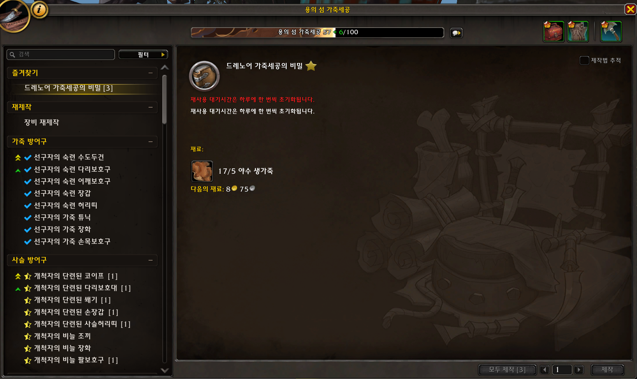 초기화가 아침 8시 이기때문에 하루에 한번씩만 드레노어 가죽세공의 비밀과 빛나는 가죽을 꾸준히 만드시면 됩니다.