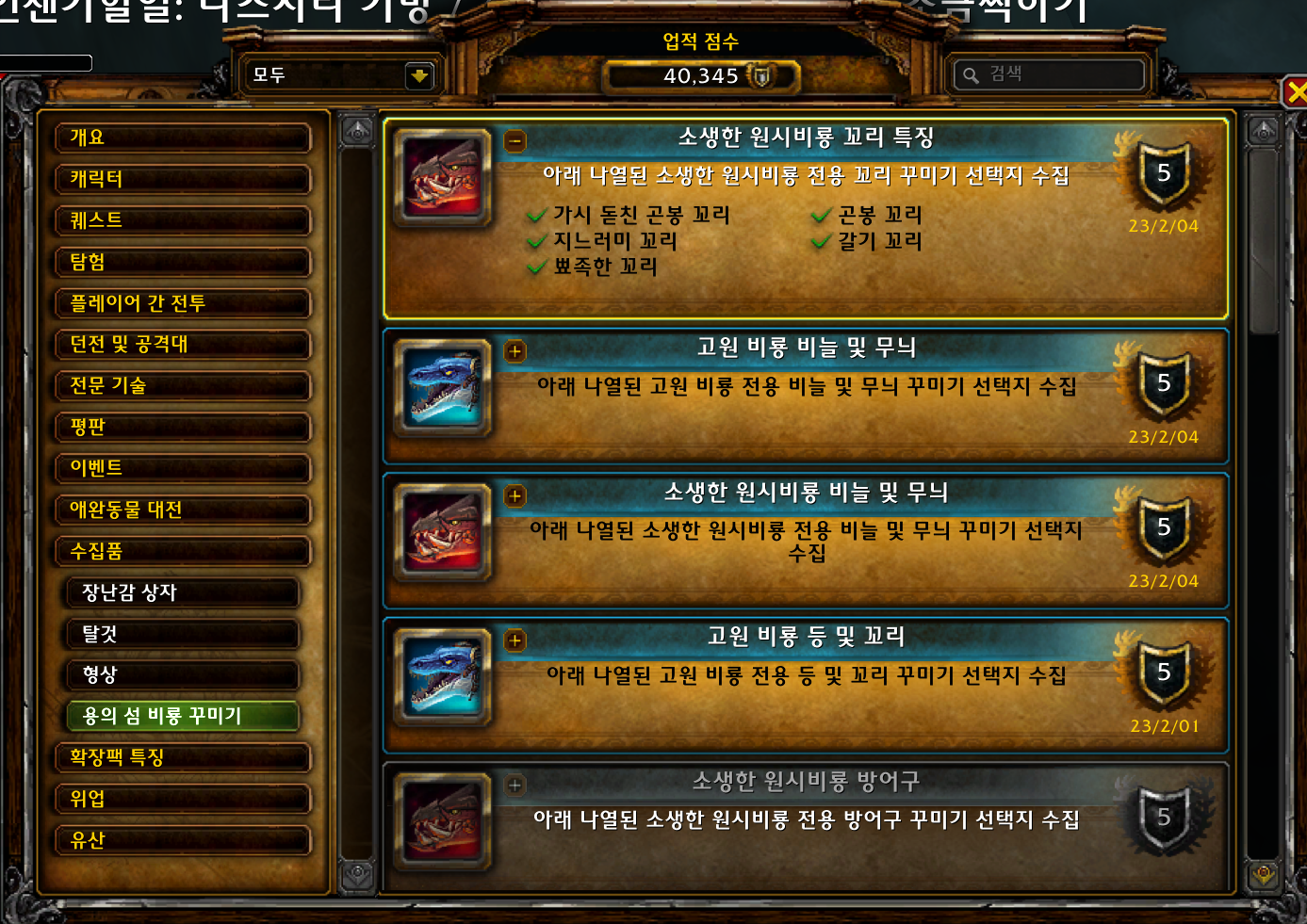 소생한 원시비룡 꼬리 특징 업적은 10.0.5에 생긴업적으로 5개를 모으는업적입니다.