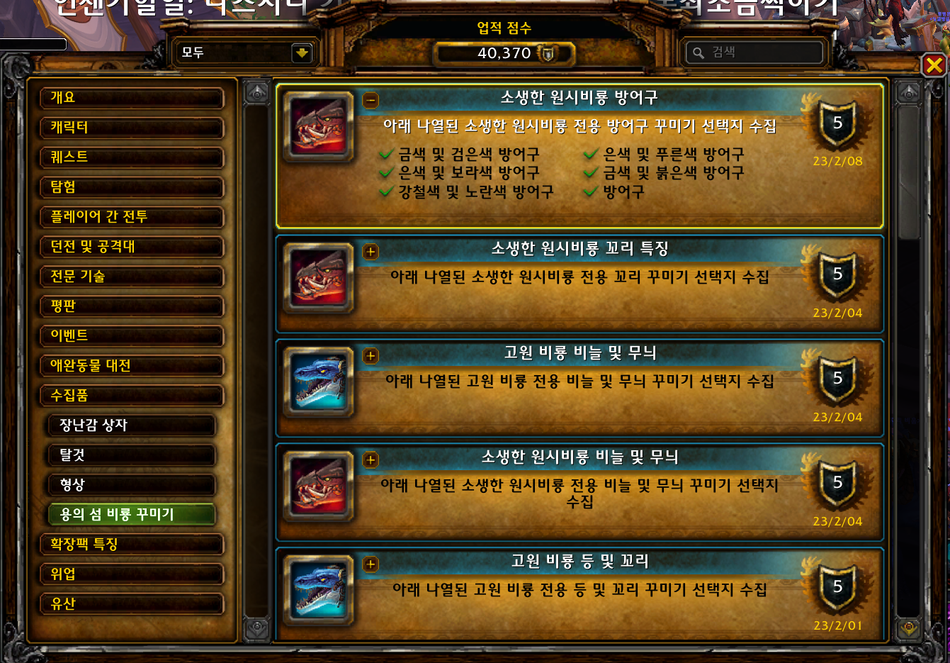 소생한 원시비룡 방어구 업적은 10.0.5에 생긴업적으로 6개를 모으는업적입니다.