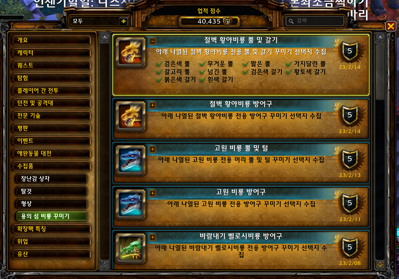 절벽 황야비룡 뿔 및 갈기 업적은 10.0.5에 생긴업적으로 10개를 모으는업적입니다.