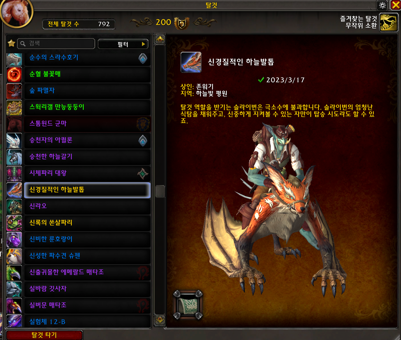 2023.03.17 신경질적인 하늘발톱 획득 792번째 탈것