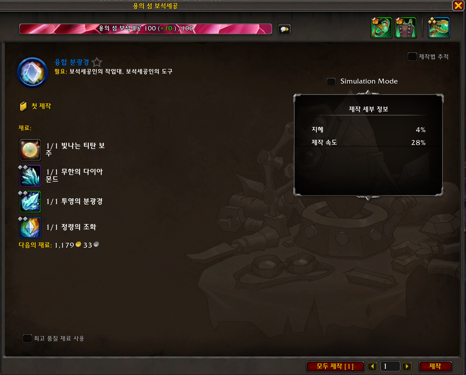 빛나는 티탄 보주 1개 / 무한의 다이아몬드 1개 / 투영의 분광경 1개 / 정령의 조화 1개 입니다.