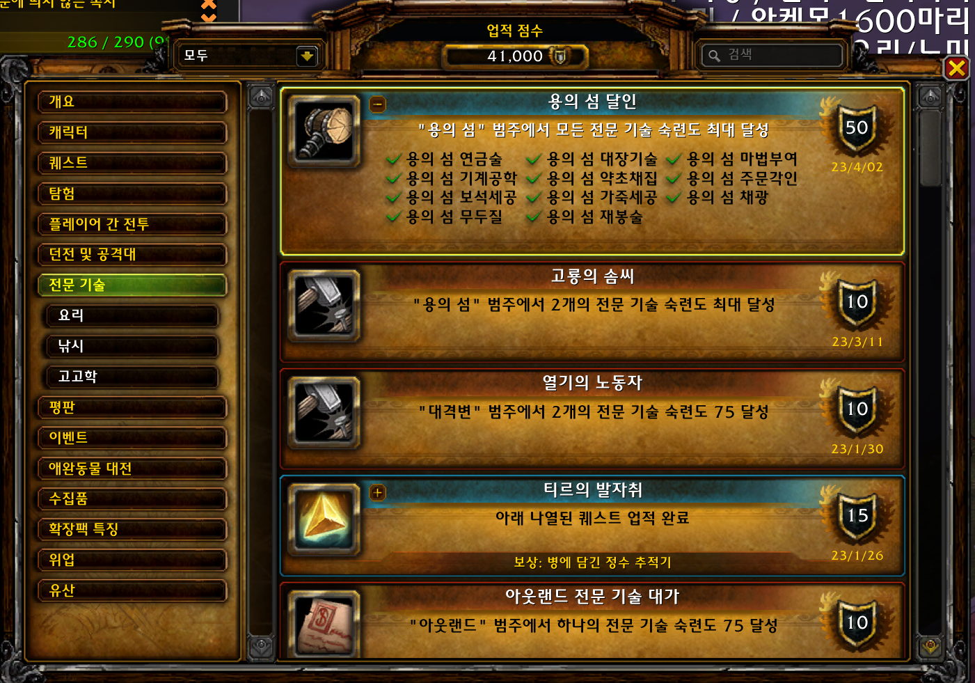용의 섬 달인 업적은 용군단버전 모든 전문기술 만숙찍는 업적입니다.