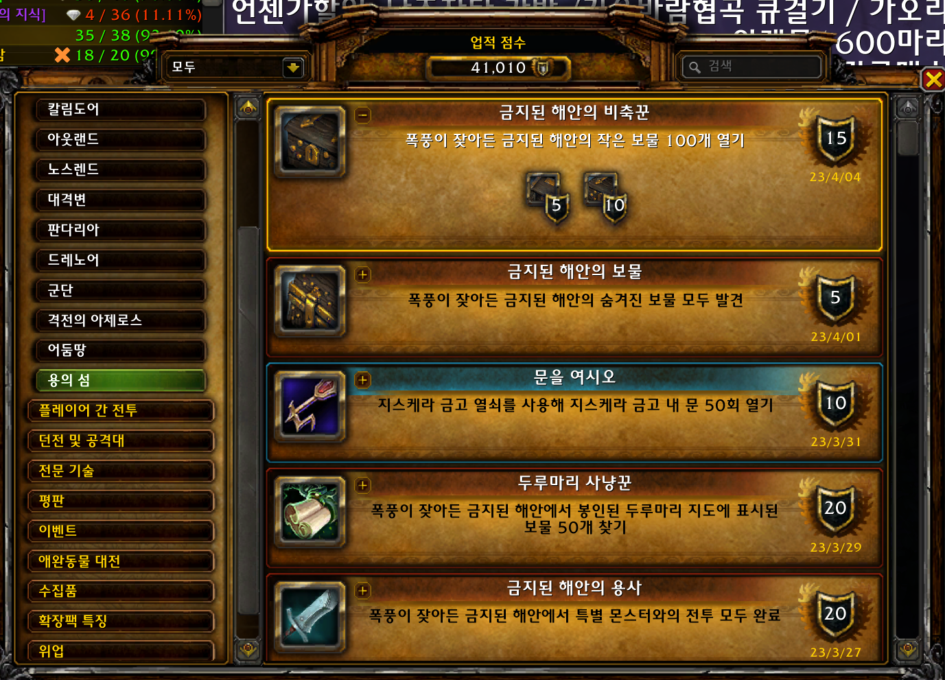 2023.03.31 금지된 해안의 청소부 획득 5점짜리 40945점 금지된 해안의 청소부 업적은 용군단 업적으로 보물 20개를 찾는 업적입니다. 금지된 해안 여관 왼쪽에 용비늘원정대 영예사절 npc가 넘치는