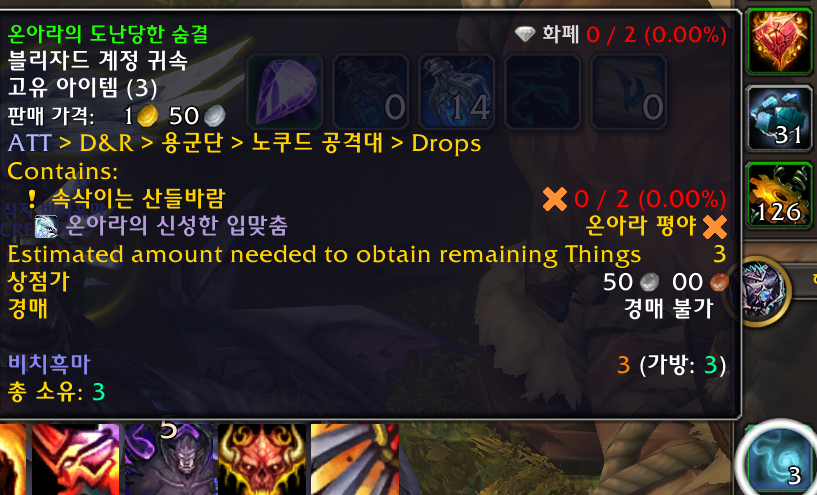 온아라의 도난당한 숨결 3개 / 기세의 향3성 1개 / 각성의 정수 1개가 필요합니다.
