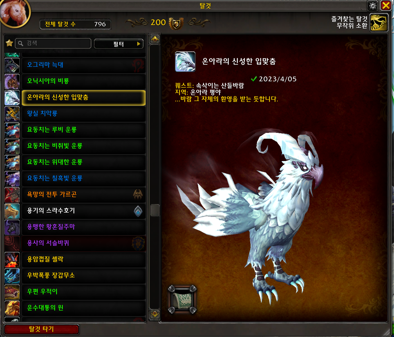 2023.04.05 온아라의 신성한 입맞춤 획득 796번째 탈것