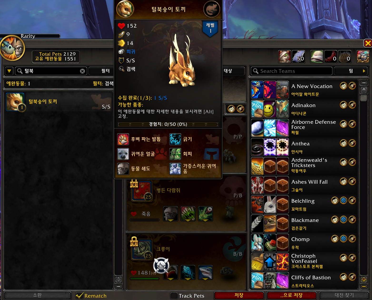 턱붕숭이 토끼 애완동물은 용군단 애완동물로 금지된해안에서 특이품 자루에서 낮은확률로 나옵니다.