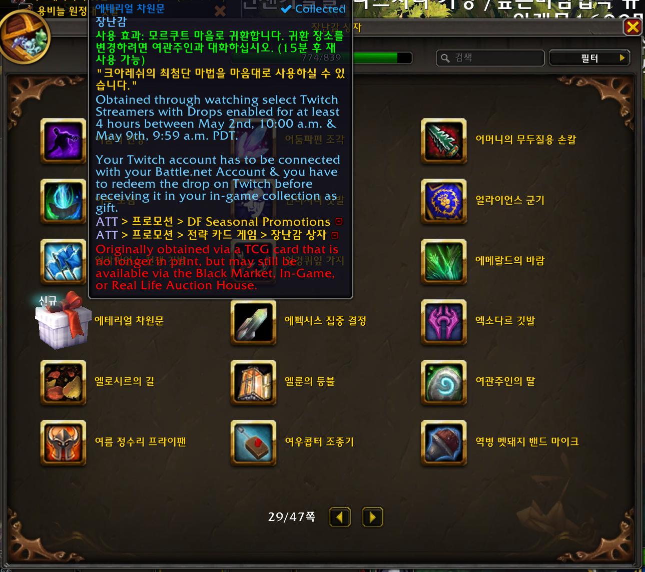 에테리얼 차원문 장난감은 10.1패치 기념으로 트위치drop으로 획득하는 장난감입니다.