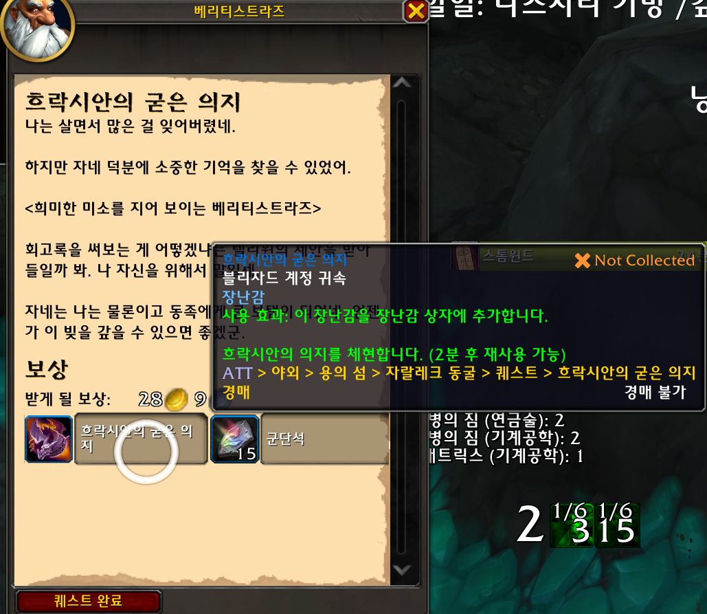 이야기를 다들으면 흐락시안의 굳은 의지가 퀘를 주고 장난감을 줍니다.