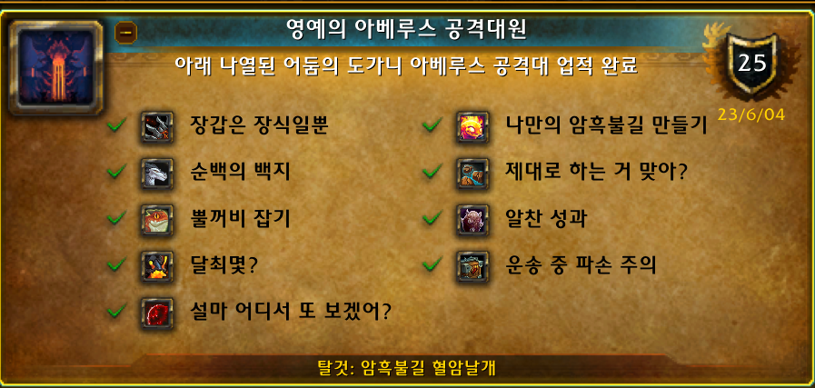 2023.06.04 영예의 아베루스 공격대원 획득 25점짜리 41665점 아베루스 공격대 업적입니다. 네임드가 9개라서 9개입니다. 장갑은 장식일뿐 / 나만의 암흑불길 만들기 / 순백의 백지 / 제대로 하는 거