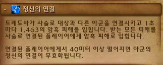 트레도바는 정신의 연결이라는 스킬을 사용합니다. 플레이어들을 서로 사슬로 연결하고 1초당 1463의 피해를 입힙니다. 사슬은 사슬 대상자들끼리 40미터 이상 떨어지게 되면 풀립니다.