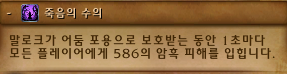 또한 어둠포용을 사용하면 아군은 죽음의 수의 디버프에 걸립니다. 1초마다 일정데미지를 받는 디버프입니다. 즉 어둠포용 효과를 오랫동안 지우지 못하면 말라죽게 됩니다. 어둠포용을 지우는 방법이바로