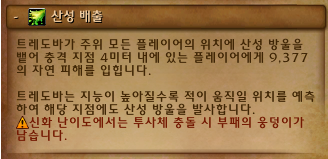 트레도바는 주기적으로 산성배출이라는 스킬을 사용합니다. 기본적인 바닥피하기 스킬입니다. 그런데 트레도바의 지능이 높아짐에 따라 플레이어의 움직일 위치를 예측하여 추가로 바닥을 깝니다.
