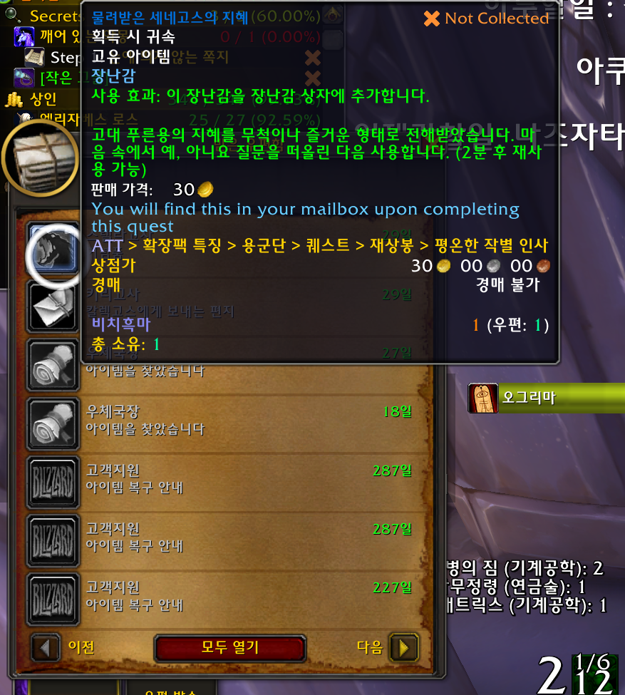 물려받은 세네고스의 지혜 장난감은 용군단 확장팩 장난감으로 10.1 패치에 추가된 푸른용군단 대장정을 전부 완료하면 주는 보상입니다.