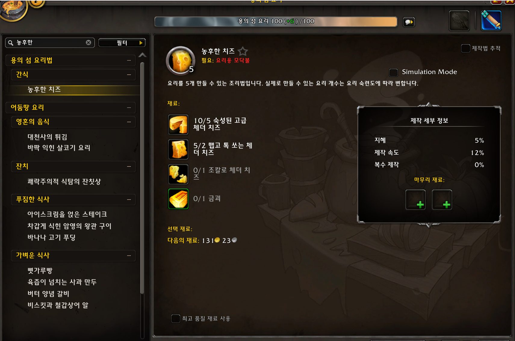 1번만들면 5개이고 농후한 치즈 50개가 필요하니