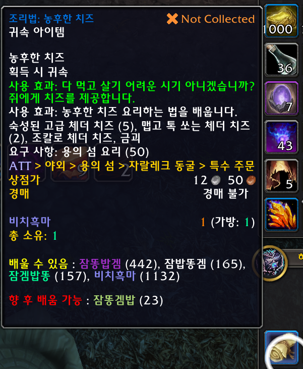 숙성된 고급 체더 치즈 5개 / 맵고 톡 쏘는 체더 치즈 2개 / 조칼로 체더 치즈 1개 / 금괴 1개가 필요합니다.