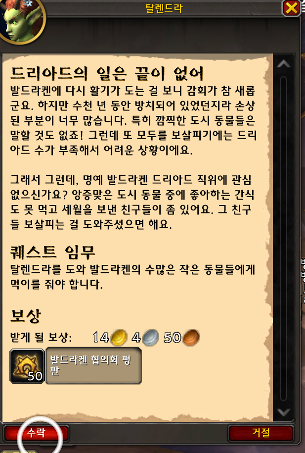 해당 퀘스트를 완료하면 명예 드리아드 라는 칭호를 줍니다. 이 칭호는 하루가 지나면 사라지기 때문에 부캐로 진행해야 합니다. 혹은 귀환석등으로 이동해도 사라진다고 합니다.
